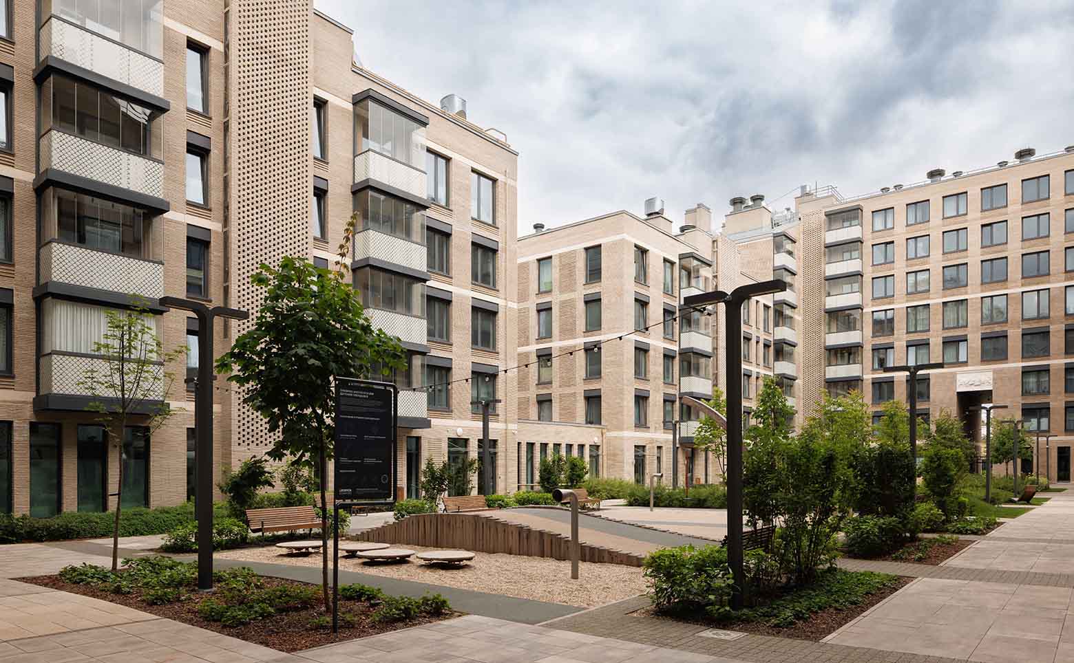 Проект представляет собой 2 здания высотой в 3 и 6 этажей. Они возведены по кирпичной технологии строительства с фасадами облицованными штукатуркой.