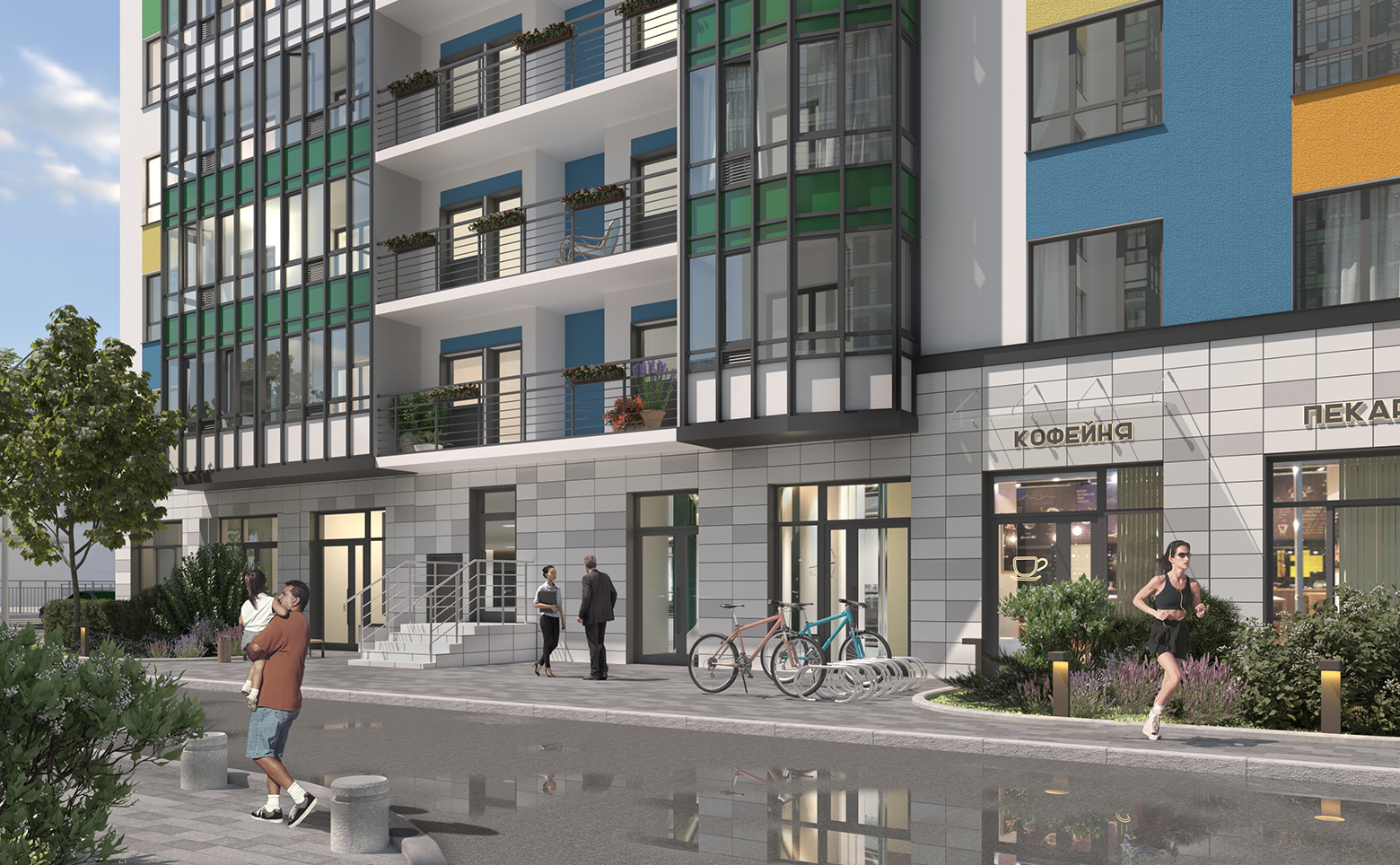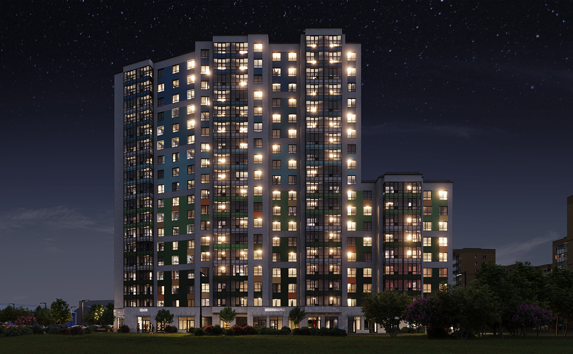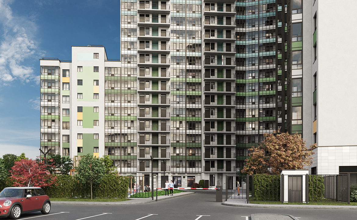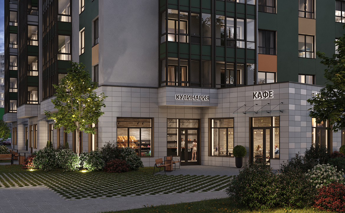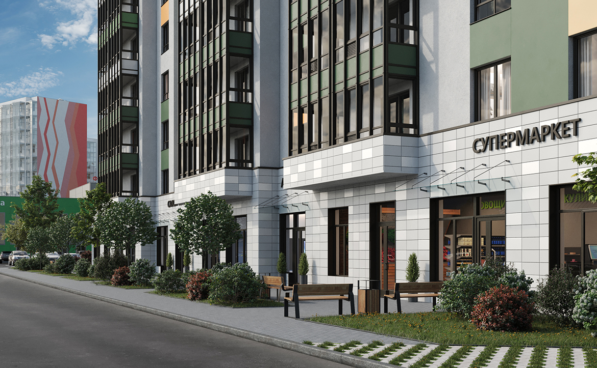 Территория комплекса закрыта и находится под охраной. Обустроены детские и спортивные площадки, зона отдыха, экодорожки с разноуровневым озеленением и архитектурными арками с подсветкой. На нижних этажах расположены коммерческие помещения под магазины, аптеки, салоны красоты и другие объекты. Владельцам авто доступна большая парковочная зона.