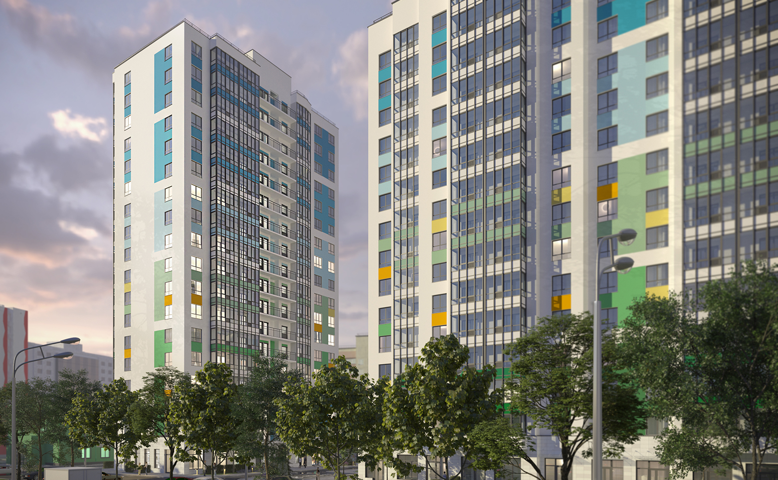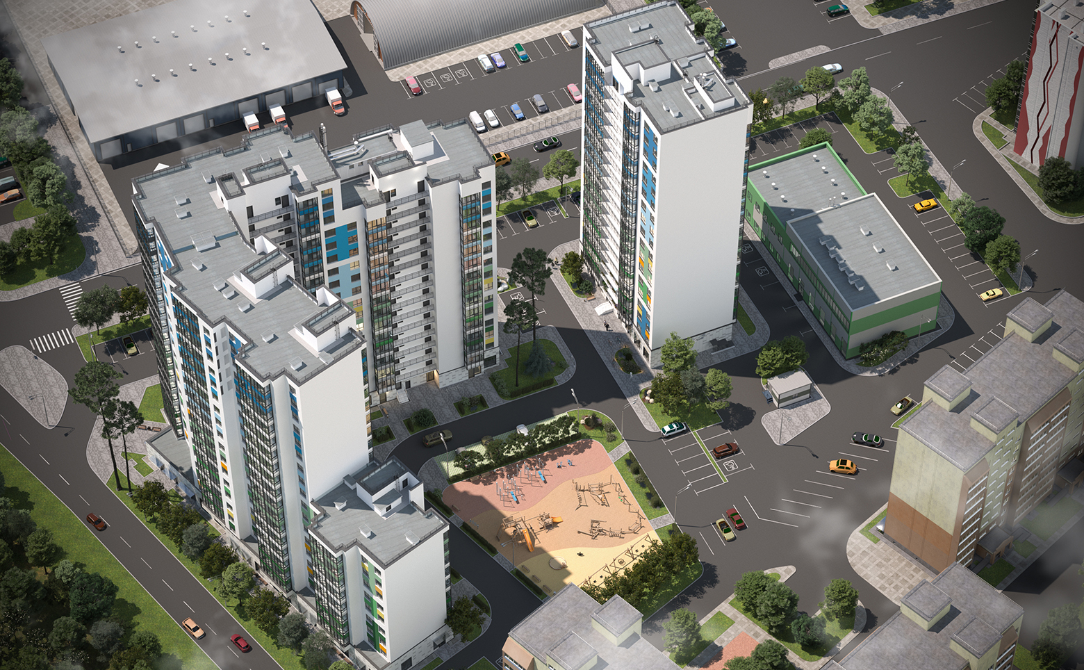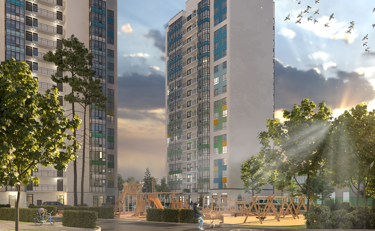 Территория комплекса закрыта и находится под охраной. Обустроены детские и спортивные площадки, зона отдыха, экодорожки с разноуровневым озеленением и архитектурными арками с подсветкой. На нижних этажах расположены коммерческие помещения под магазины, аптеки, салоны красоты и другие объекты. Владельцам авто доступна большая парковочная зона.