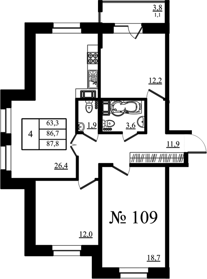 - Комнат: 4Е-к.кв