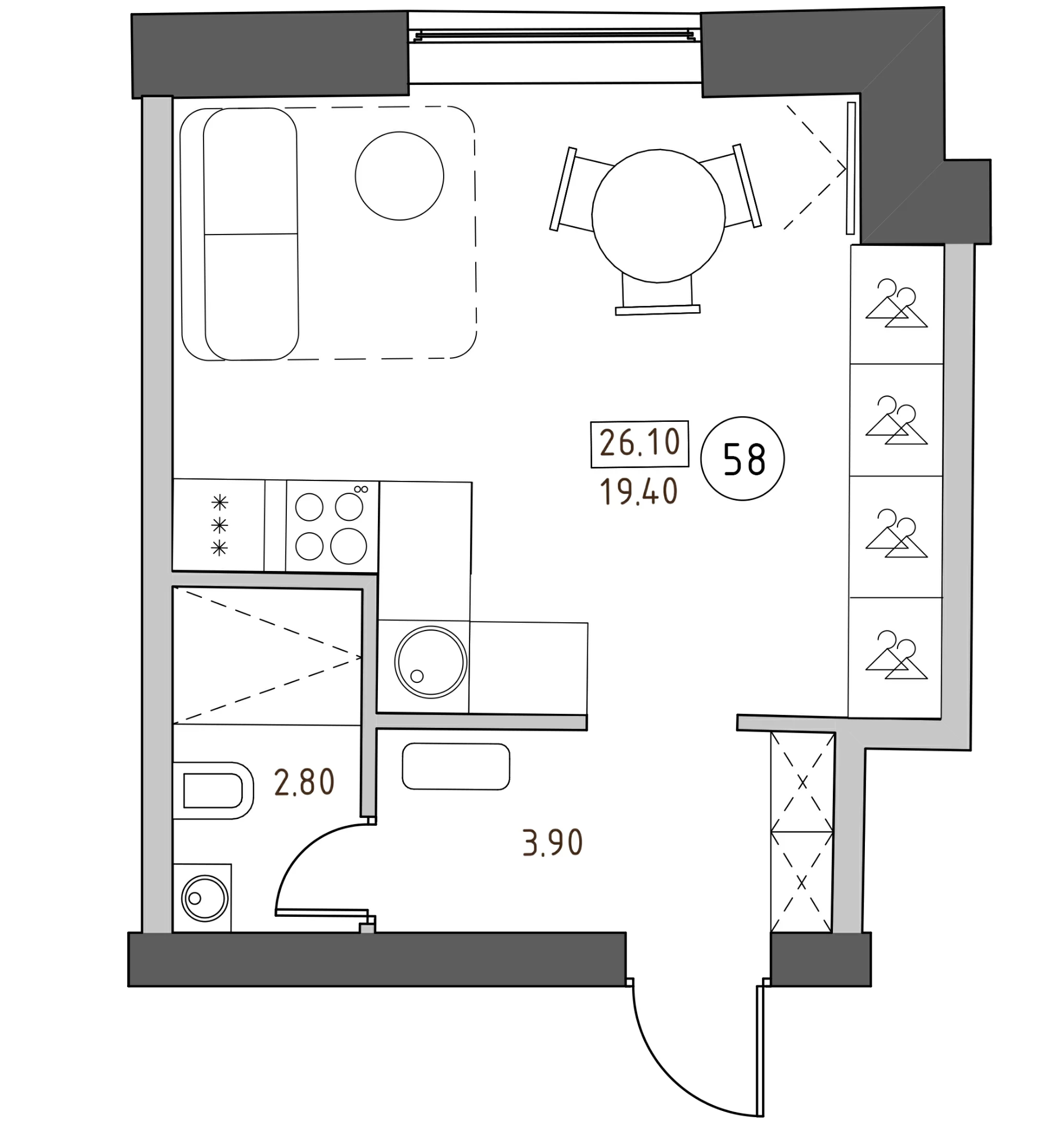 - S общая: 26.1 м2