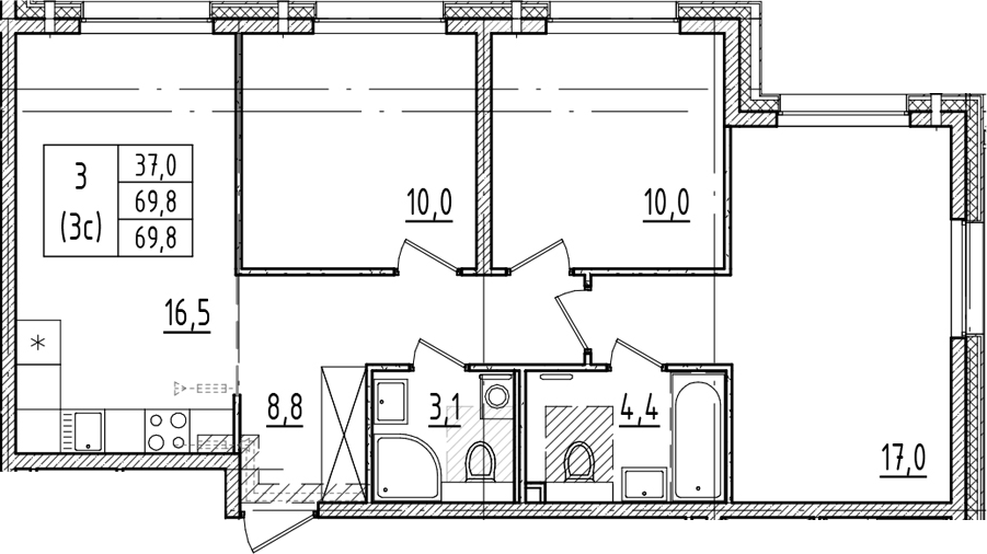 - S общая: 69.8 м2