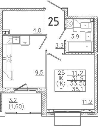 - Комнат: 1-к.кв