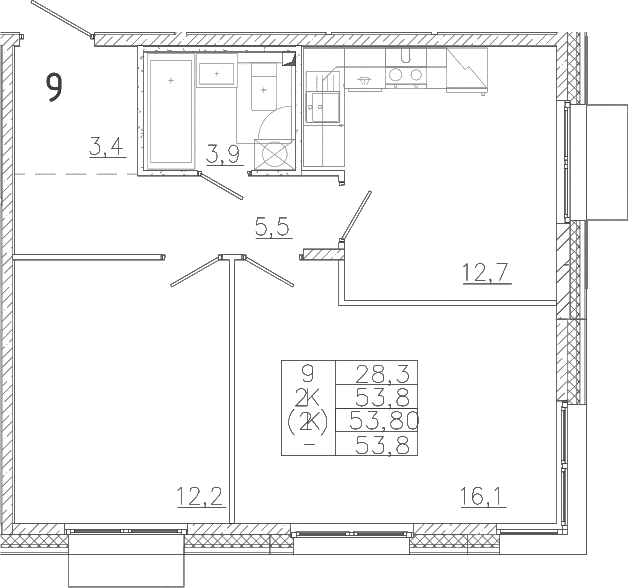 - S общая: 53.8 м2