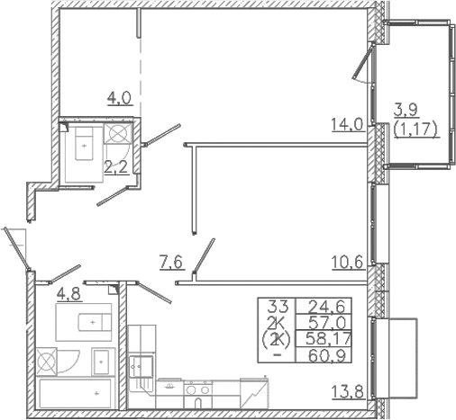 - Комнат: 2-к.кв