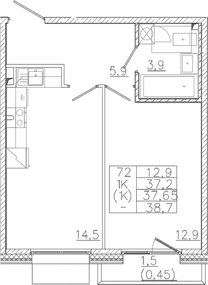 - Комнат: 1-к.кв