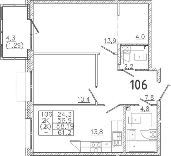 - S общая: 56.9 м2