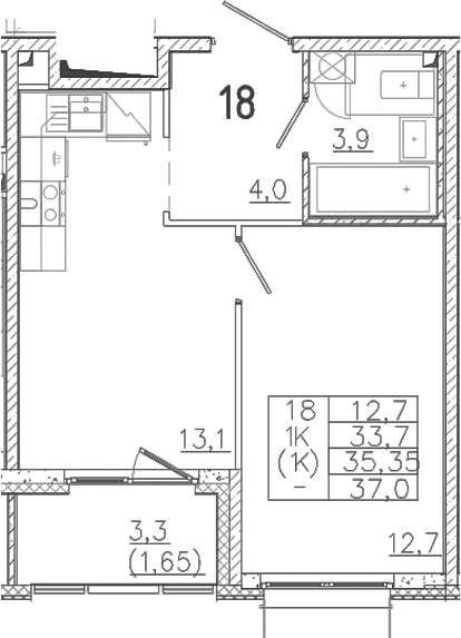 - S общая: 33.7 м2