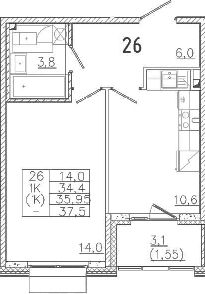- Комнат: 1-к.кв
