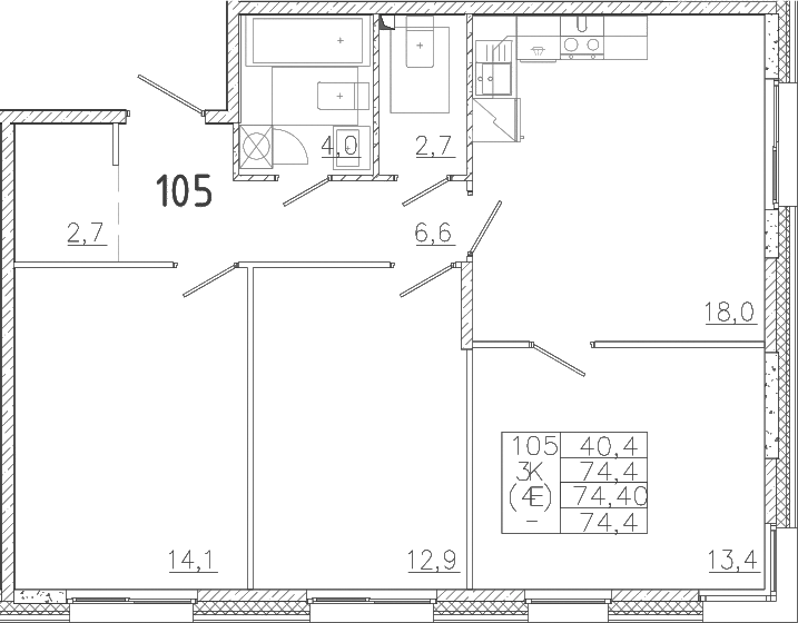 - S общая: 74.4 м2