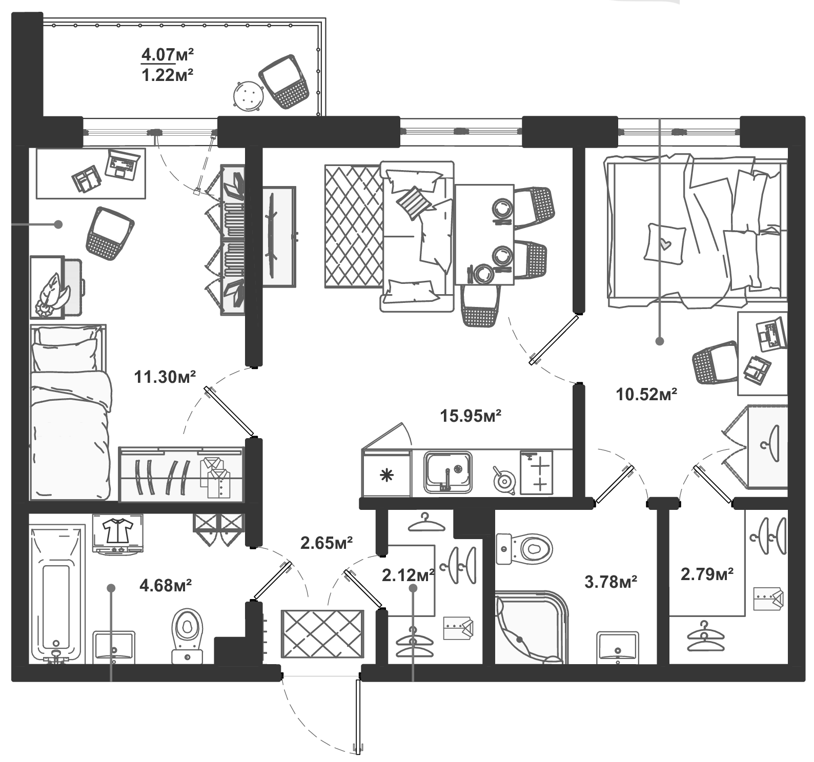 В жилом комплексе предложено множество планировочных решений: в наличии квартиры, как классического типа, так и европланировки. Сдаются они с чистовой отделкой и установленной системой «Умный дом». Основная высота потолков в квартирах составляет 2,67 метра, а в зоне прихожей — 2,47 метра. Окна видовых квартир выходят на лесопитомник.