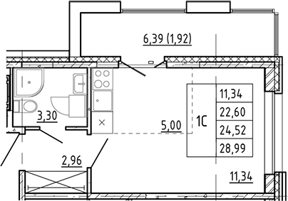 - S общая: 22.6 м2
