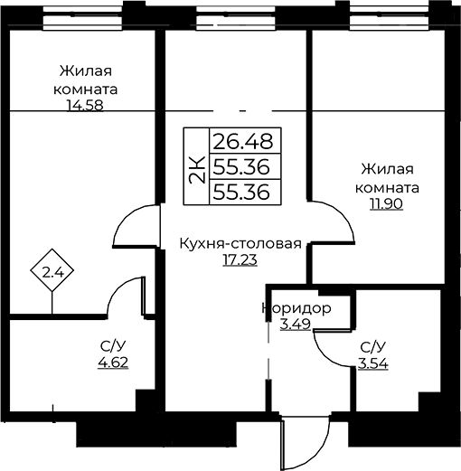 - S общая: 55.36 м2