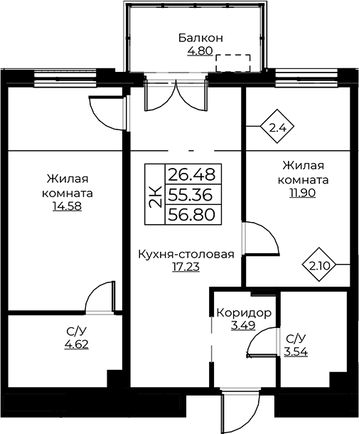 - S общая: 55.36 м2