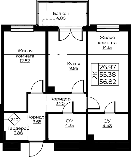 В проекте предложено множество планировочных решений: в наличии квартиры, как классического типа, так и европланировки. Сдаются они с чистовой отделкой в 2 цветовых решениях, высотой потолков от 2.67 до 4.27 метров и увеличенными окнами. Двухуровневые квартиры сдаются без отделки, с высотой потолков на 1 этаже — 2.97, 2 этаже — 3.1 метров. В ЖК имеются лоты с террасами и видом на лес.