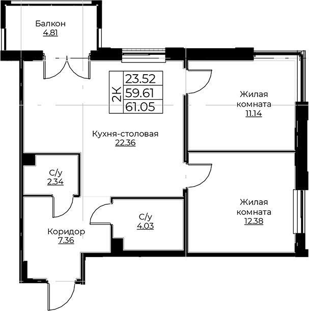 - S общая: 59.61 м2
