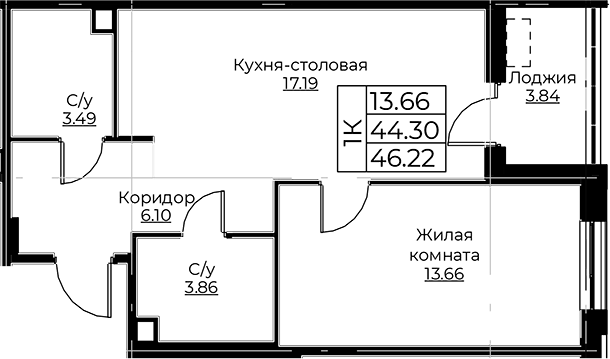 - S общая: 44.3 м2