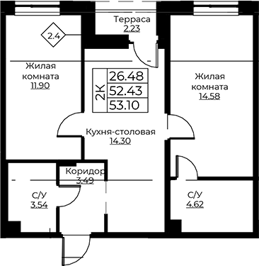 - S общая: 52.43 м2
