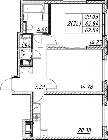 - S общая: 62.84 м2