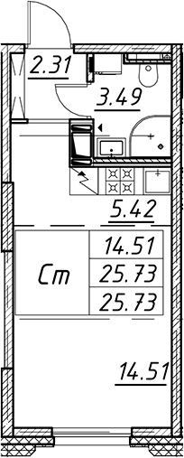 - S общая: 25.73 м2