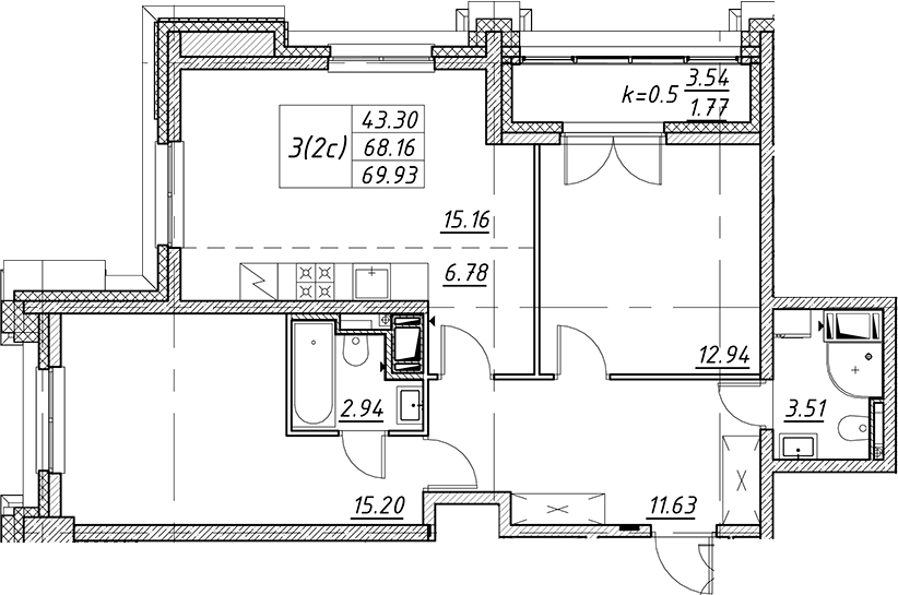 - S общая: 68.16 м2