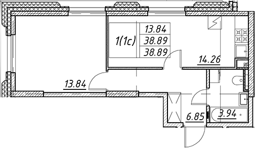 - S общая: 38.89 м2