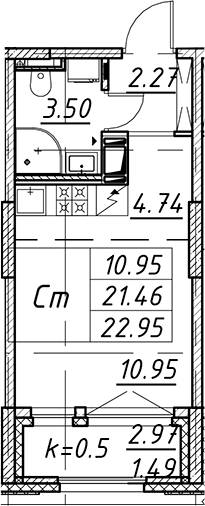 - S общая: 21.46 м2