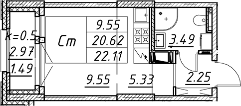 - Комнат: Студия