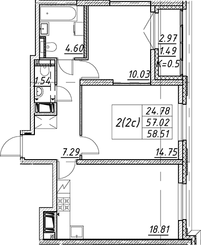 - S общая: 57.02 м2