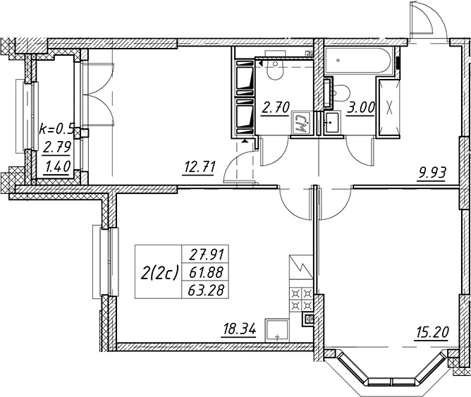 - S общая: 61.88 м2