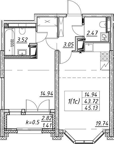 - S общая: 43.72 м2