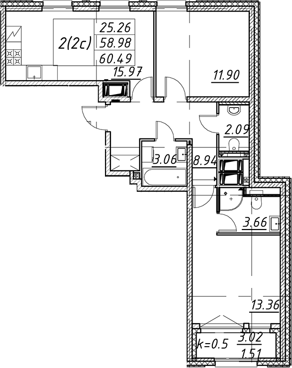 - S общая: 58.98 м2