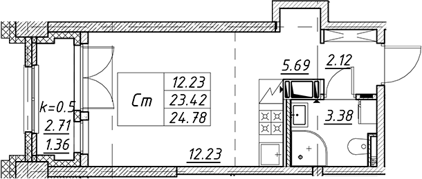 - S общая: 23.42 м2