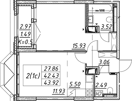 - S общая: 42.43 м2
