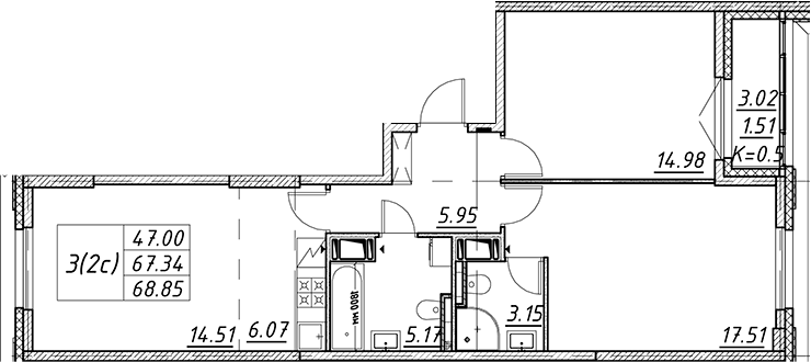 - S общая: 67.34 м2