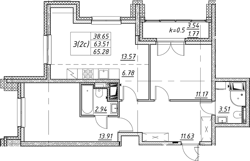 - S общая: 63.51 м2