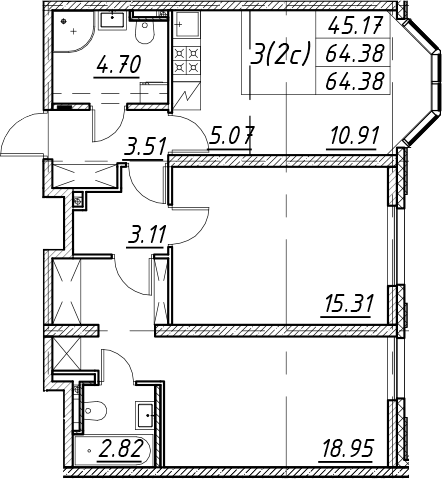 - S общая: 64.38 м2