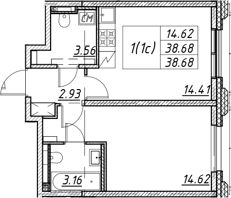 - S общая: 38.68 м2