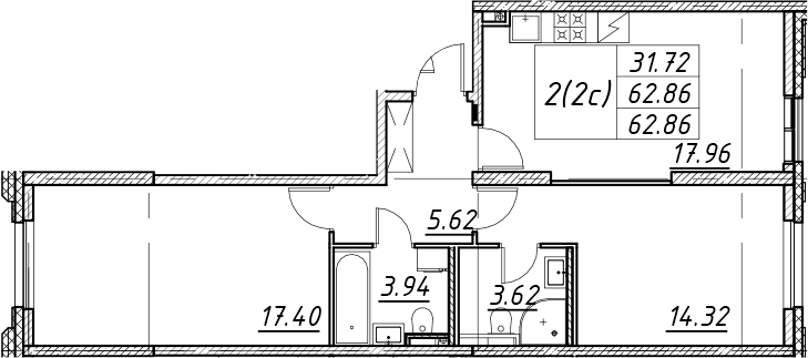 - S общая: 62.86 м2