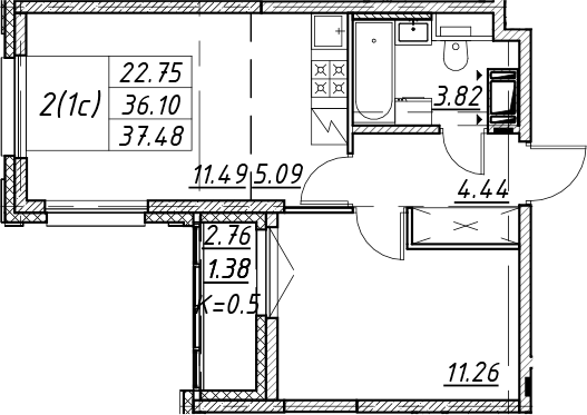 - S общая: 36.1 м2