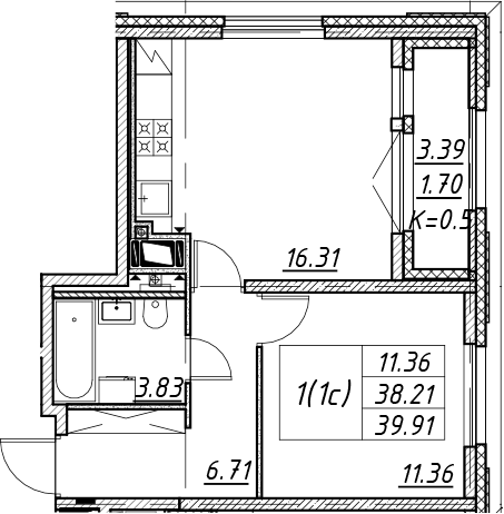 - S общая: 38.21 м2