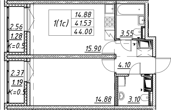 - S общая: 41.53 м2