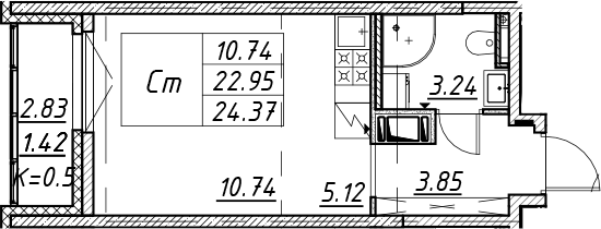 - S общая: 22.95 м2