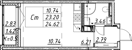 - S общая: 23.2 м2