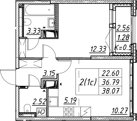 - S общая: 36.79 м2