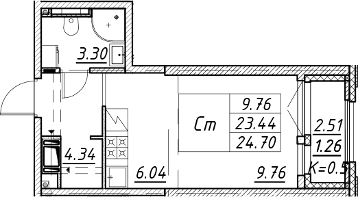- S общая: 23.44 м2