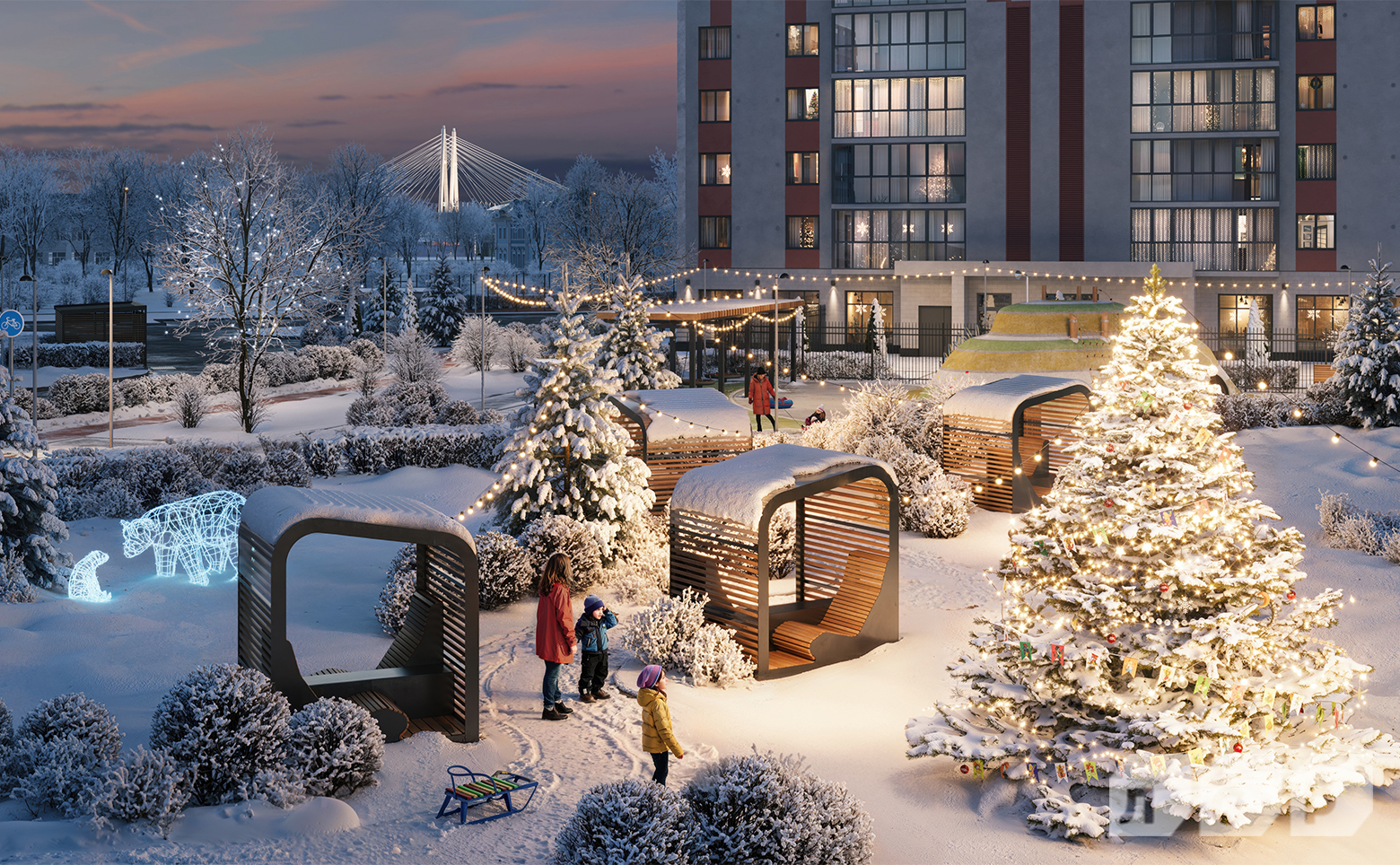 Придомовая территория благоустроена по принципу «безбарьерное пространство» и включает в себя: игровые комплексы, спортивные площадки и турники, зоны для йоги, лаунжи и воркауты, магазины и сервисы. По всей территории выполнено ландшафтное озеленение. На первых этажах находятся коммерческие помещения. У комплекса есть свой детский сад и школа. Для автовладельцев предусмотрены паркинги и станции зарядки автомобилей. Владельцы собак могут воспользоваться площадкой для выгула собак.