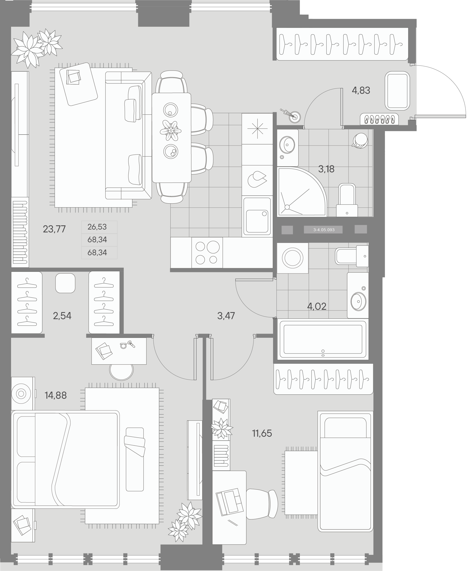- S общая: 68.34 м2