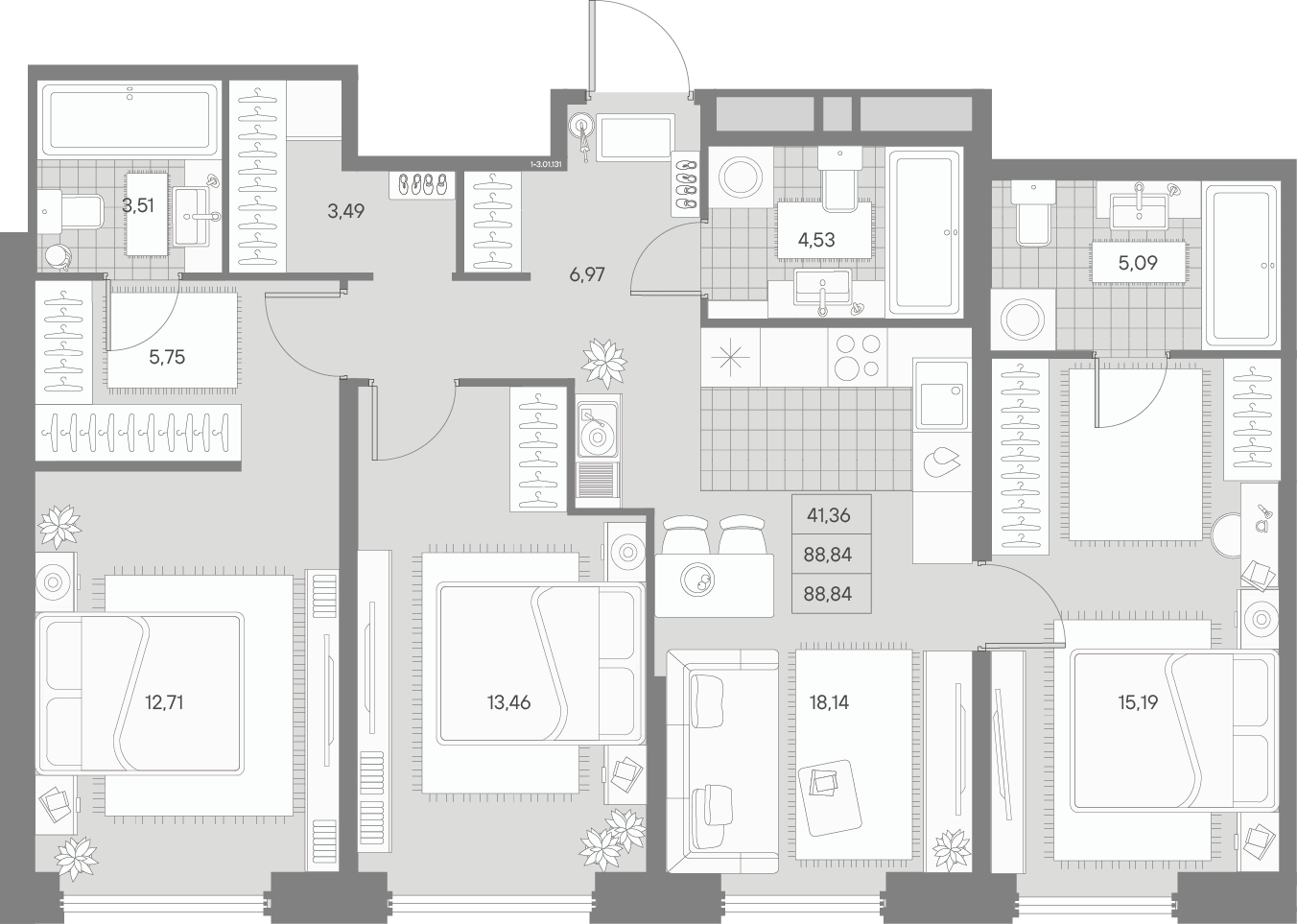 - S общая: 88.84 м2