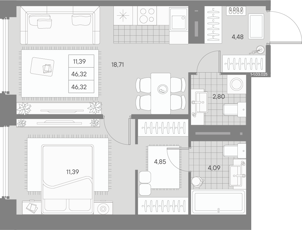 - S общая: 46.32 м2